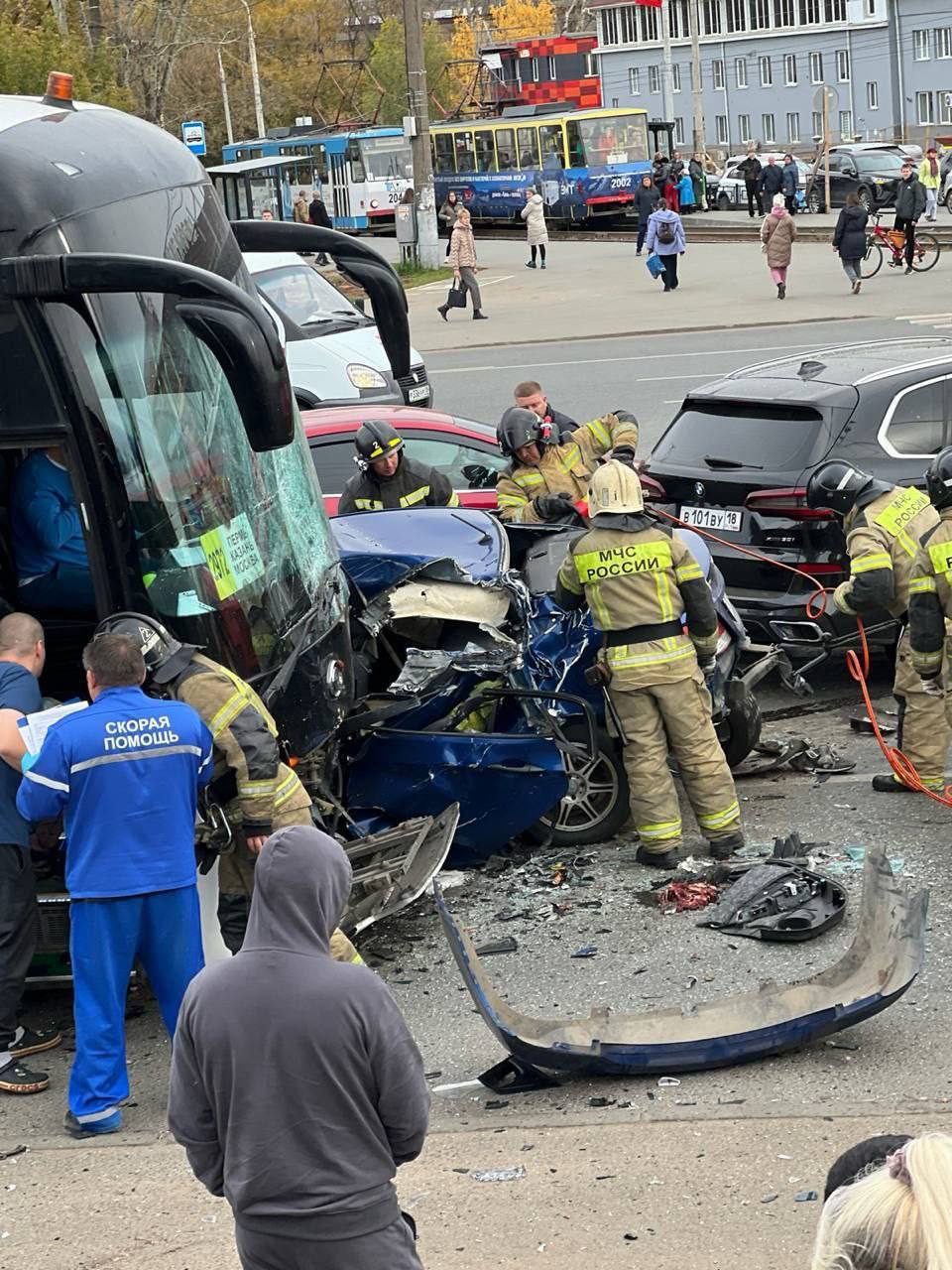 Столкнулись рейсовый автобус «Казань–Пермь» и 3 легковых автомобиля. Одна из машин, предварительно, влетела в толпу.