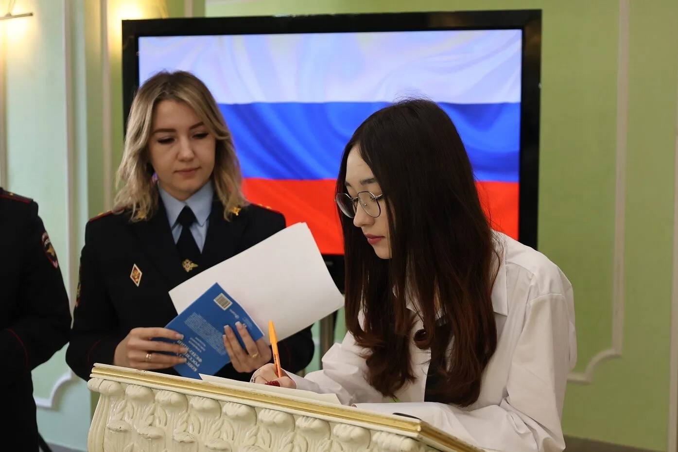 Сотрудники МВД по Удмуртской Республике провели торжественную церемонию принесения Присяги иностранными гражданами, которые приобрели гражданство Российской Федерации. 22 иностранных гражданина поклялись соблюдать Конституцию и законодательство Российской Федерации, права и свободы граждан страны, исполнять обязанности гражданина России, уважать её культуру, историю и традиции, двое из них лица, достигшие возраста 14 лет.