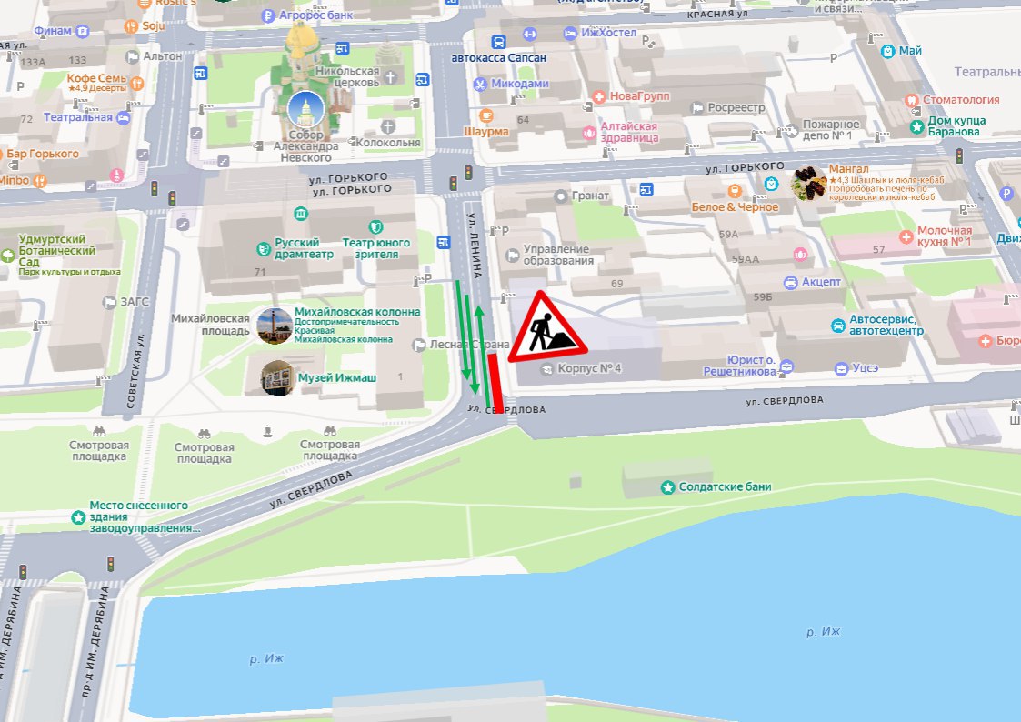 С 14 по 19 октября в Ижевске на улице Ленина, в районе спуска на набережную, будет ограничено движение по направлению в центр.