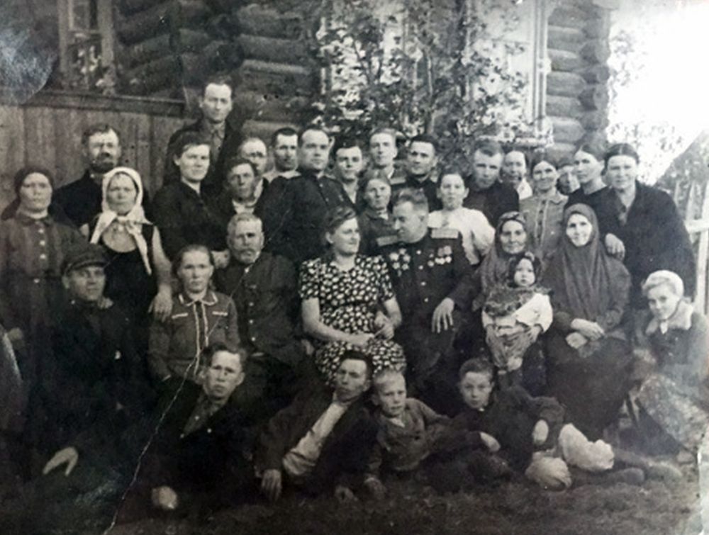 На фото из семейного архива героя генерал Сабуров в кругу родных рядом с родительским домом в победном 1945 году.