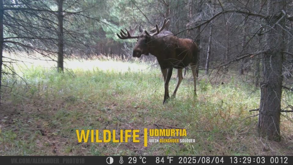 Фотоловушка зафиксировала взрослого самца с крупными рогами, а после него — совсем ещё молодого, в возрасте примерно двух лет. Посмотрите, какие массивные и раскидистые рога у старшего, они почти достигли уже своего апогея, у младшего же...