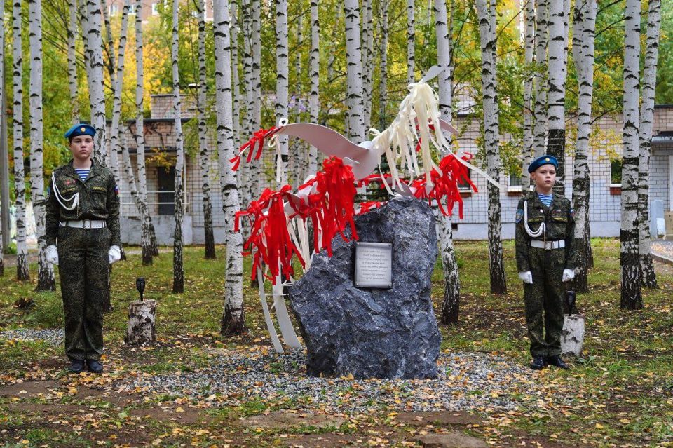 На ней выбита дата - 26 сентября 2022 года - и высечены 18 имен детей и взрослых, которых потеряла школа.