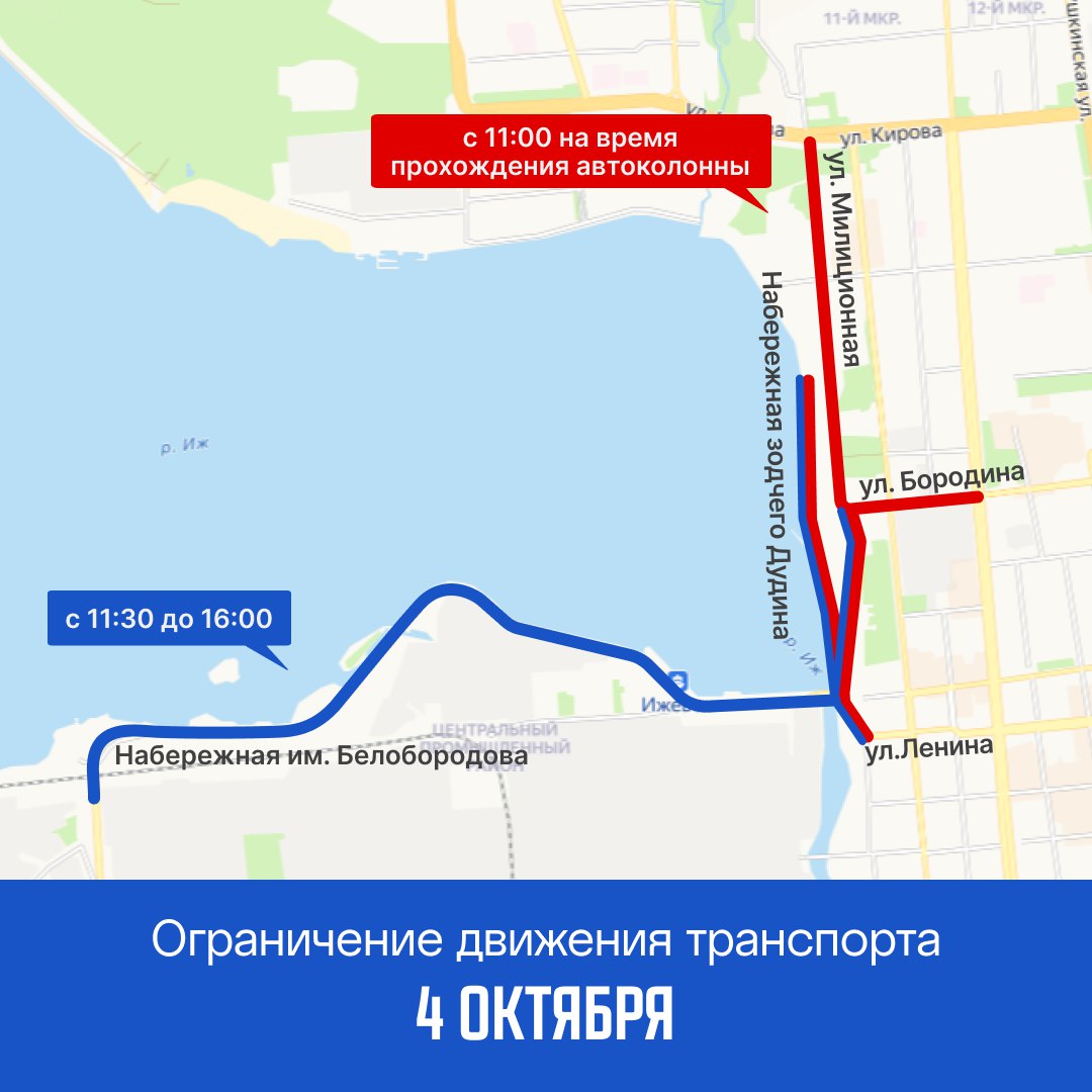 С 11:00 на время прохождения колонны машин по маршруту Набережная — Милиционная — Кирова — Удмуртская движение временно приостановят, сообщила администрация Ижевска.