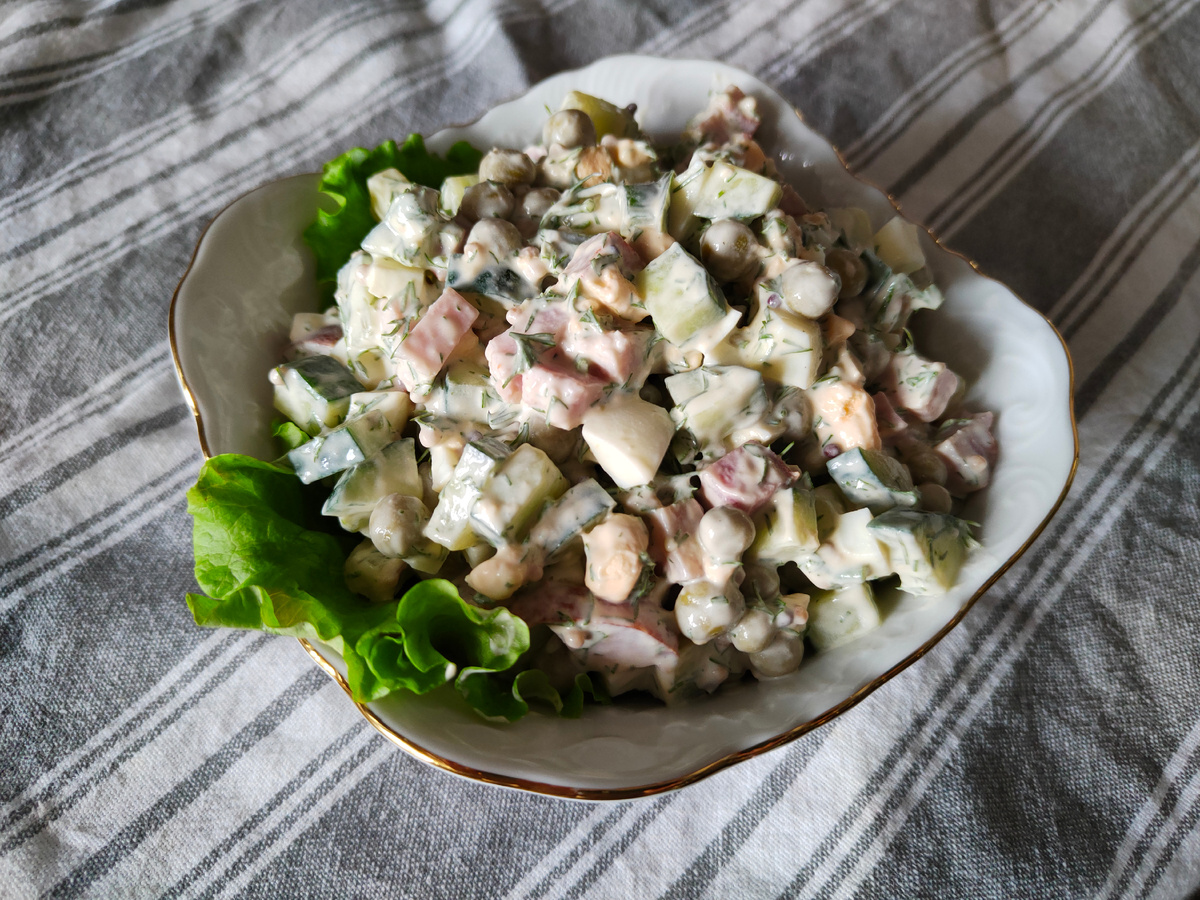 Салат «Оливье» - это блюдо, ставшее неизменным атрибутом новогоднего застолья. Обычно его готовили с картофелем, морковью, яйцами, колбасой «Докторская», луком и маринованными огурцами, дополненное щедрой порцией майонеза. Иногда в рецепте встречались и более дорогие замены вроде отварного мяса или языка, что придавало ему более изысканный вкус.