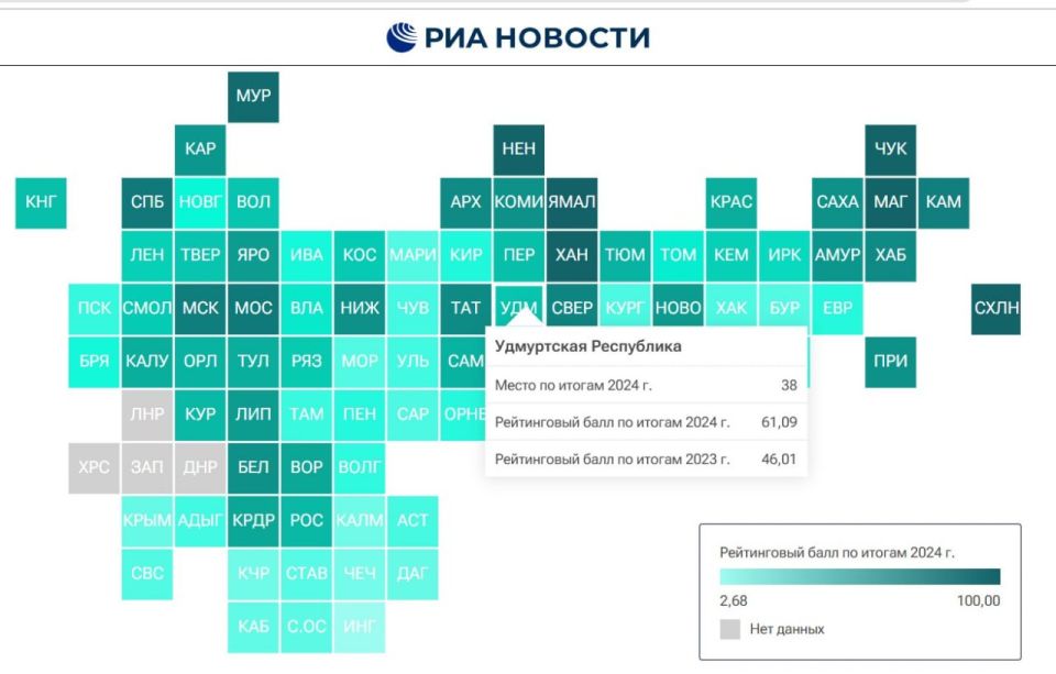 В рейтинге регионов России по материальному благополучию населения по итогам 2024 года, составленном РИА Рейтинг, Удмуртия заняла 38-е место.