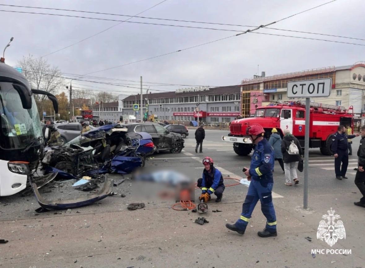 Четыре человека погибли в Ижевске при столкновении рейсового автобуса и трех автомобилей, сообщают очевидцы.