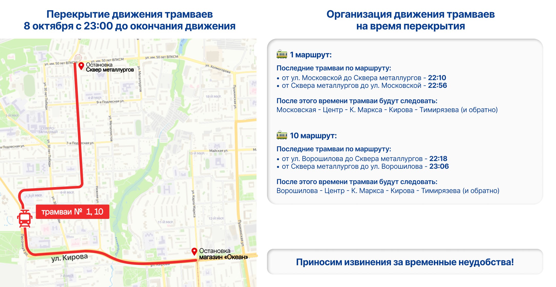 8 октября, с 23:00 до окончания движения, будет закрыт проезд трамваев № 1, 10 на участке от магазина «Океан» до Сквера металлургов.