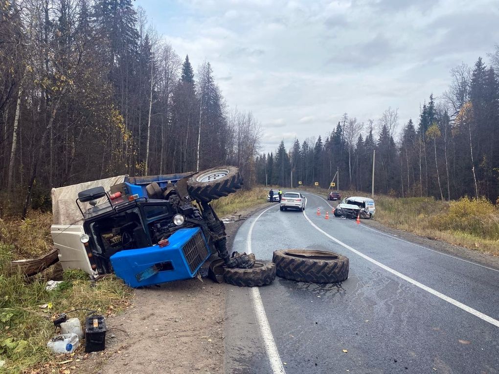 По предварительным данным, 54-летний водитель автомобиля «Лада Ларгус» в пути следования не справился с управлением, допустил занос транспорта, выехав на встречную полосу, где столкнулся с трактором «МТЗ» с прицепом под управлением 48-летнего мужчины. В результате трактор перевернулся.
