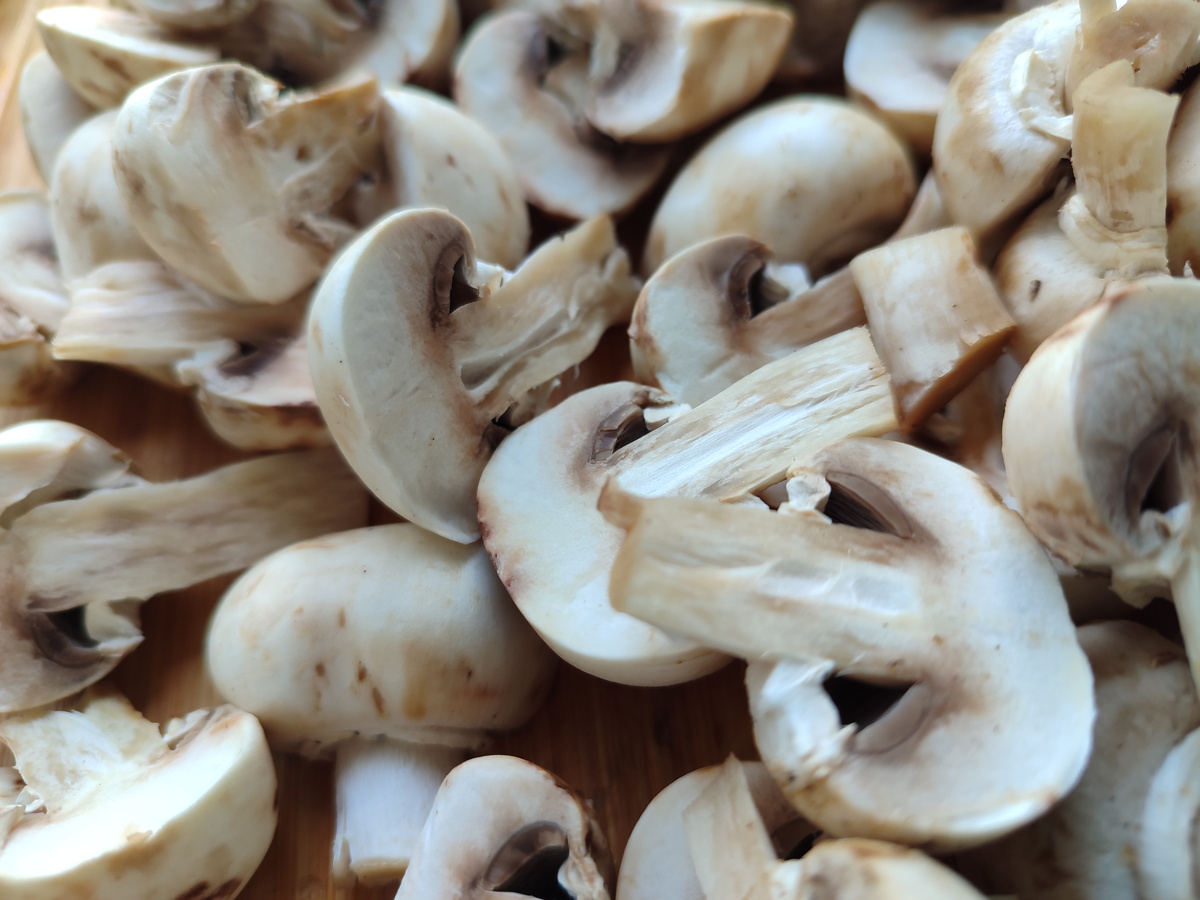 Приготовление начинается с тщательной очистки грибов. Их следует промыть, обсушить и нарезать на половинки или ломтики. В глубокой сковороде раскалить масло до появления лёгкого дымка, а затем добавить нарезанные шампиньоны, жаря их на сильном огне до образования золотистой корочки.