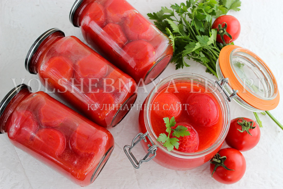 - Очищенные помидоры размещаются в стерилизованные банки. Лучше всего использовать небольшие контейнеры, чтобы избежать порчи открытых консервов. Обычно получается около 4 банок по 0,5 литра.