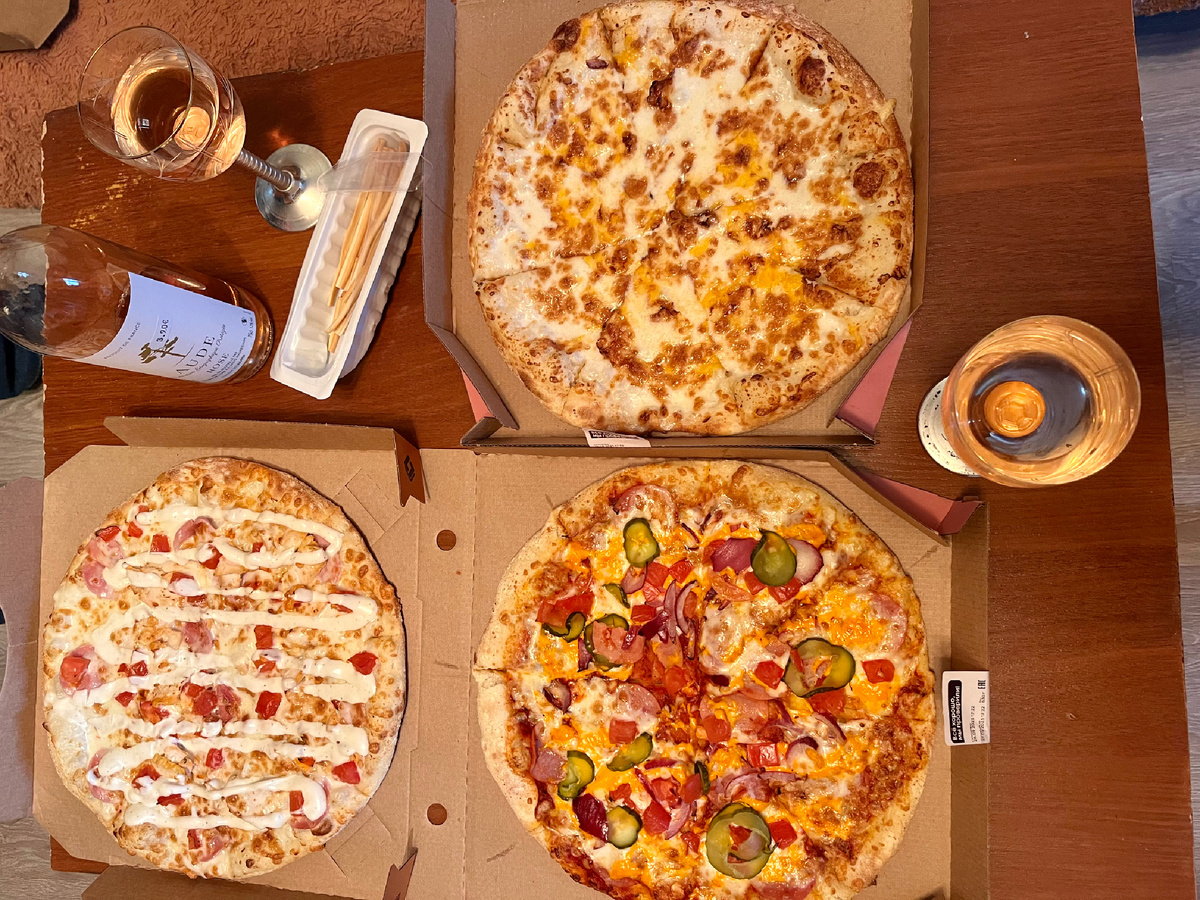 В итоге три пиццы с учетом скидки обошлись в 2000 рублей. Голод не знает преград, и с хорошим вином они прошли на ура. Однако участники вечера сошлись во мнении, что пищевая конкуренция все еще остается на стороне других брендов, таких как Пицца Хат, с их отличным тестом и сбалансированной начинкой.