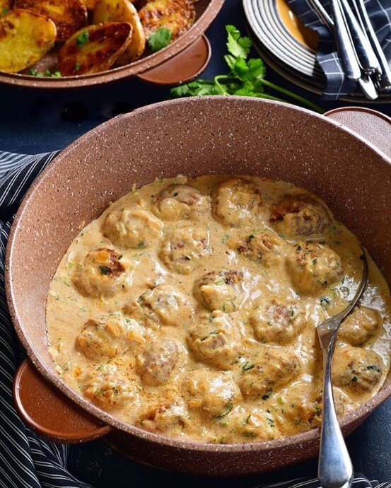 Добавляют бульон, доводят до кипения, всыпают специи и нарезанную кинзу. Затем к обжаренной муке вливают сливки, перемешивают и аккуратно добавляют к бульону. В завершение опускают фрикадельки в соус, доводят до кипения и томят ещё несколько минут. Если необходимо, досаливают и доперчивают перед подачей.