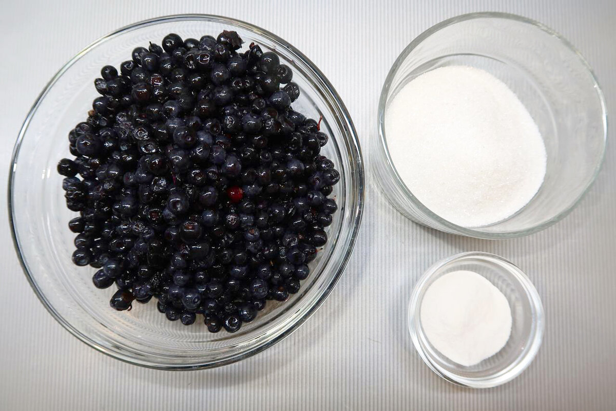 В отдельной миске смешиваются сахар и содержимое пакетика «Желфикс». После этого готовую смесь добавляют в черничное пюре и тщательно перемешивают.