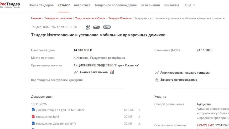 Заявки от участников электронного конкурса ждут до 24 ноября 2025 года. Итоги подведут 28 ноября. Работы по изготовлению и установке мобильных домиков должны завершить к 20 декабря этого года. Общая сумма контракта составляет 14 млн рублей.
