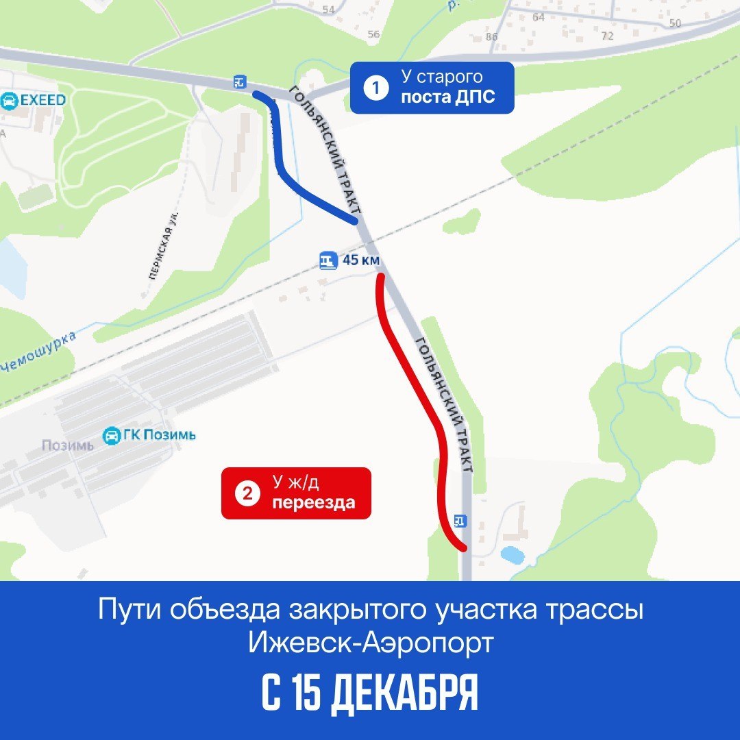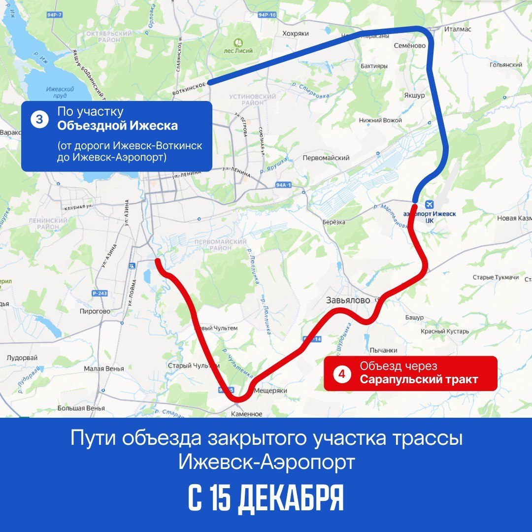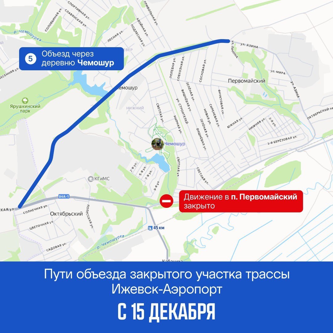 Будет также перекрыто движение на участке – Ижевск-Аэропорт-Первомайский. Объехать можно через д. Чемошур.