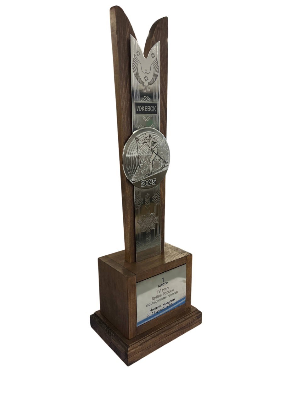 Кубок выполнен в форме символического монумента «Дружба народов» и на нем есть образ легендарной удмуртской лыжницы Галины Кулаковой — четырёхкратной Олимпийской чемпионки, 9-кратной чемпионки мира, обладательницы Кубка мира и 39-кратной чемпионки СССР.