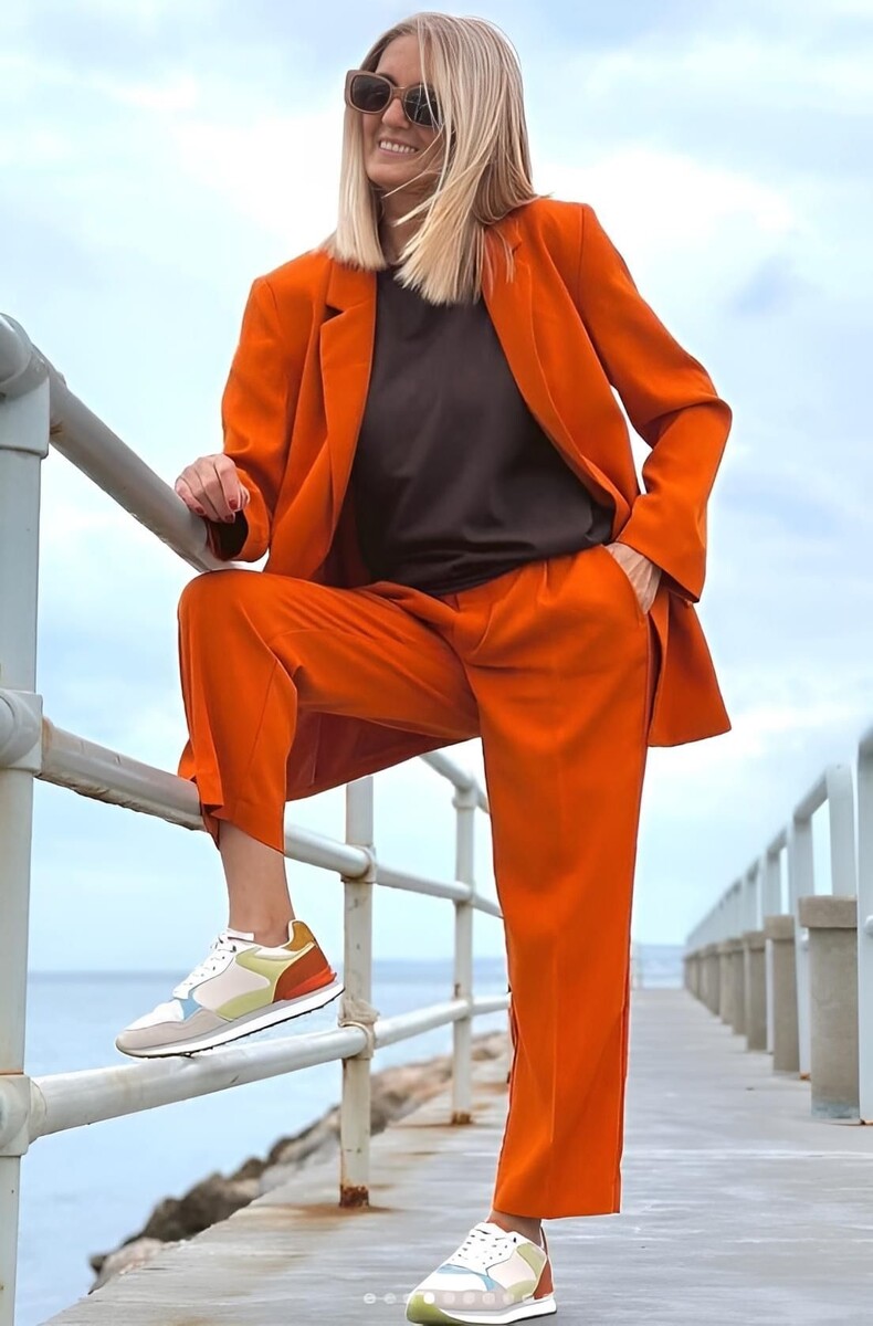 - Эксперименты с цветом: Оснащенные терракотовым костюмом с классическими брюками и жакетом оверсайз, зрелая женщина подчеркивает свой оригинальный вкус. В сочетании с черной шелковой блузкой и белыми кроссовками, такой комплект становится поистине запоминающимся.