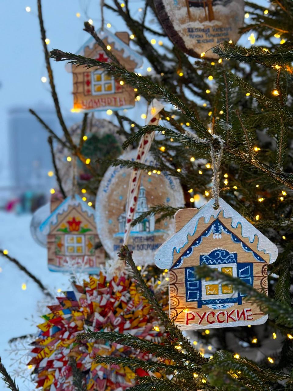 На площадке напротив отеля Izhevsk Cosmos Hotel вырос Сказочный лес из 30 новогодних красавиц. Каждая - олицетворение уникального кода районов и городов Удмуртии. А игрушки и символы на них - проявление истории и национального колорита.