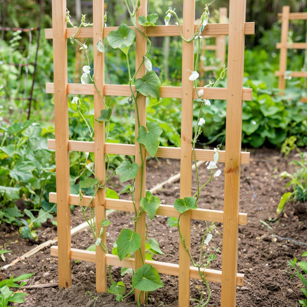 Для создания вертикальной подставки подойдут деревянные стойки или черенки от лопат. Благодаря доступности и простоте обработки дерева, это идеальный материал для такой задачи. Рекомендуется использовать четыре стойки длиной 1,5-2 метра и несколько коротких перпендикуляров, чтобы обеспечить надежную опору для увитых растений. Дерево следует обработать защитной пропиткой, такой как олифа или антисептики, чтобы предотвратить его гниение.