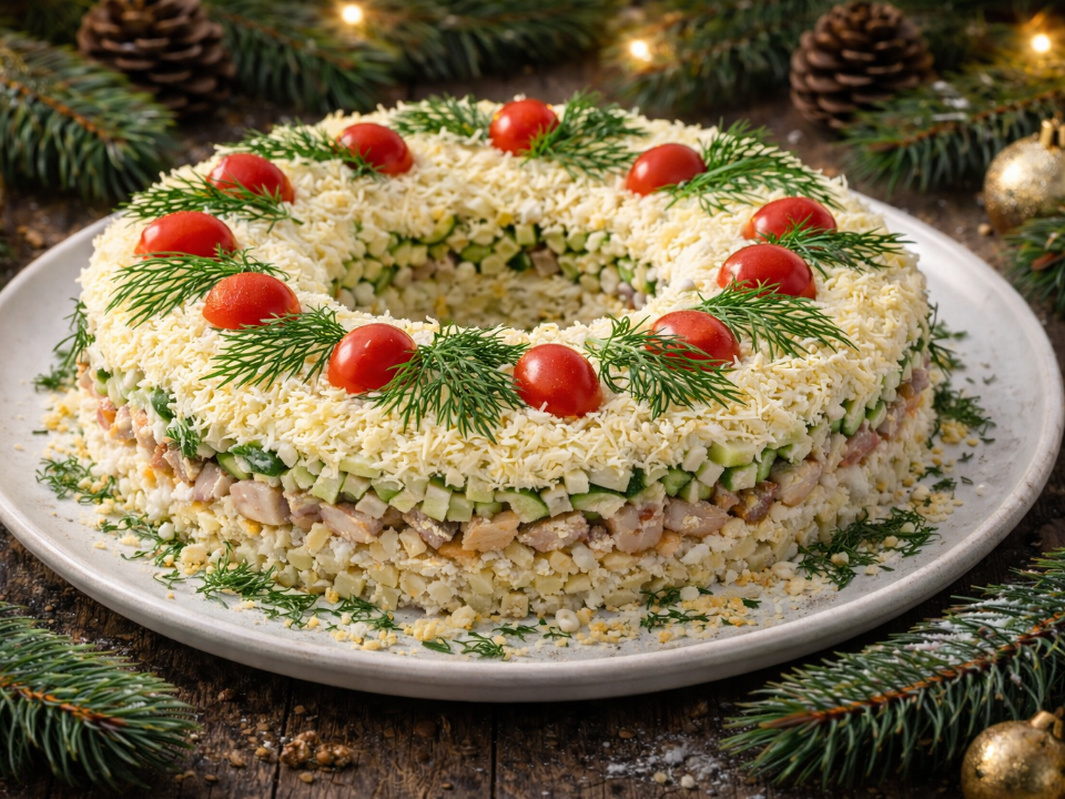 Ищете яркое и сытное угощение для праздника? Салат «Рождественский», оформленный в виде венка, станет настоящим центром внимания на любом новогоднем столе. Это блюдо прекрасно иллюстрирует, как из вполне обычных продуктов можно создать кулинарный шедевр, который обязательно порадует гостей.