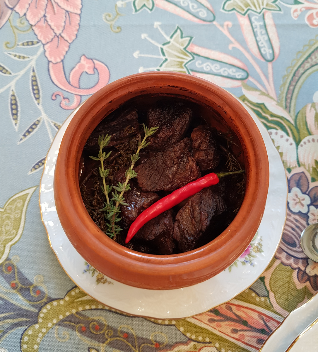 Следующий шаг — укладывание обжаренного мяса в глиняные горшочки. Сначала идет слой говядины, затем добавляются чеснок, перец и тимьян. Снова укладываем мясо, заполняя горшки до самого верха, и заливаем всё ароматным вином.