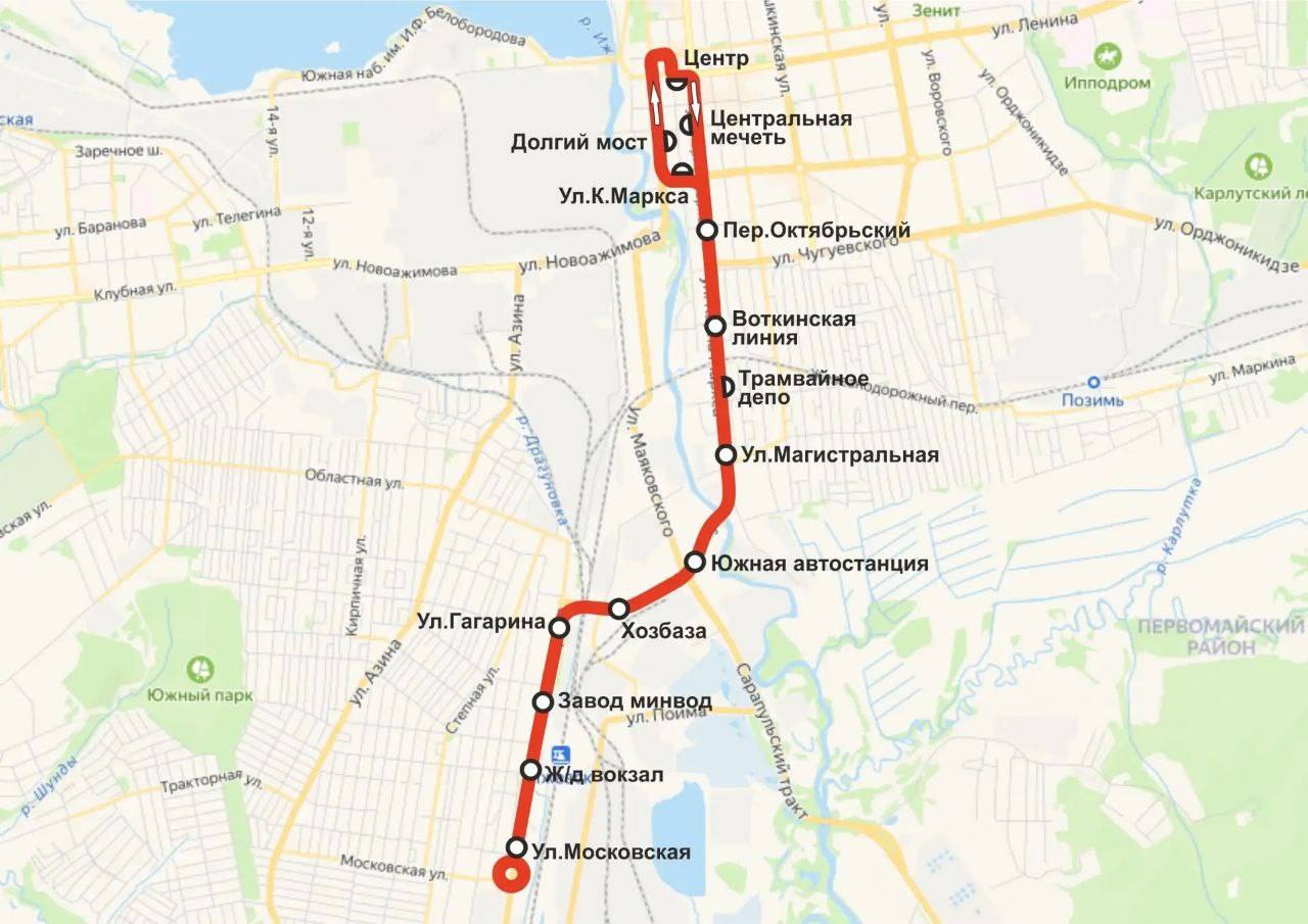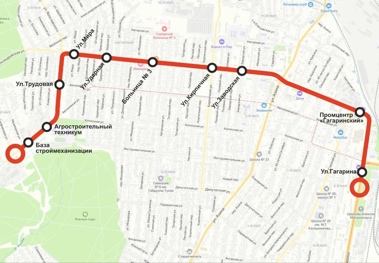 База Строймеханизации - ул. Автономная - ул. Трудовая - ул. Областная - ул. Гагарина. Обратно: ул.Гагарина - ул. Областная - ул. Трудовая - ул. Автономная - База Строймеханизации.