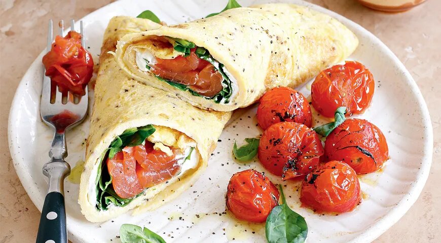 Простой способ приготовления: запеките помидоры с оливковым маслом в духовке и приготовьте омлет. Заверните нафаршированные омлеты в роллы и подайте с запеченными помидорами.
