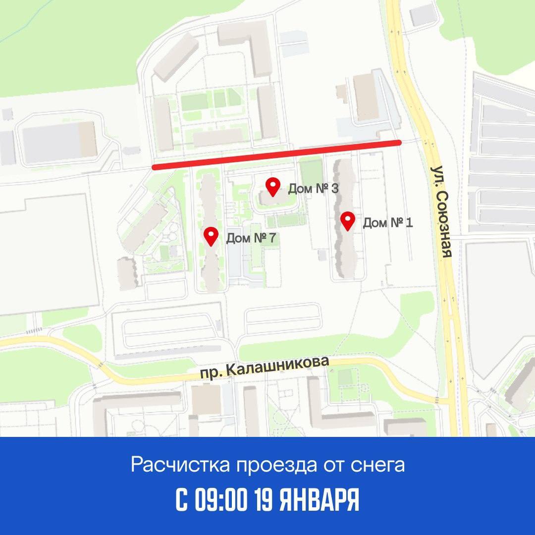— проезд от ул. Союзной вдоль домов № 1, 3, 7 по пр. Калашникова до ул. Молодежной, 111 к. 1;