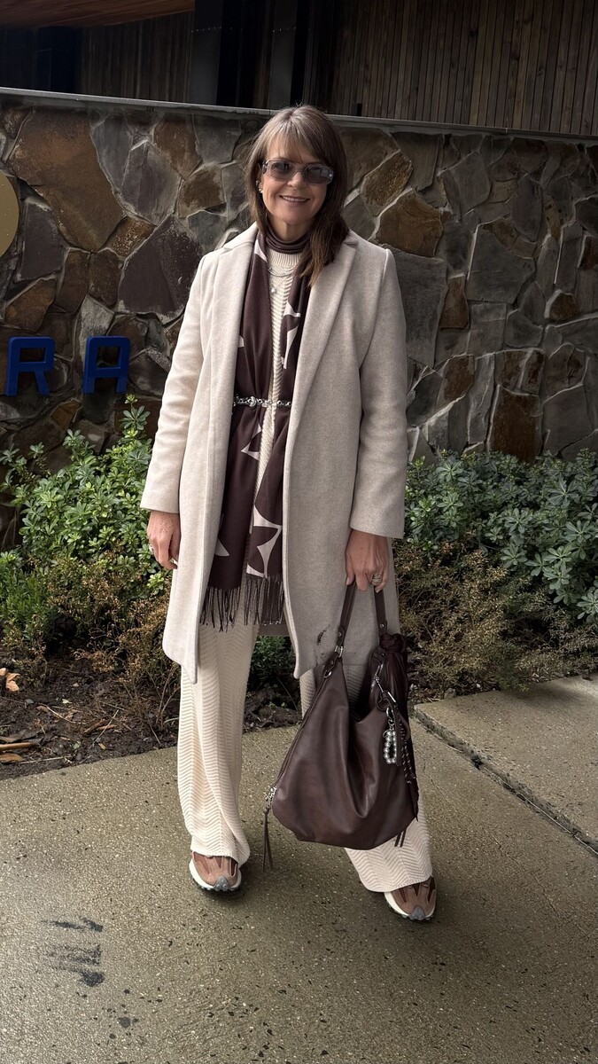 - Многослойный наряд: Одевайте свободные светлые брюки и свитер с небольшим воротником. Завершите образ укороченным пальто до колен и коричневыми аксессуарами — они станут отличным акцентом. Кроссовки на платформе добавят уверенности и стиля.