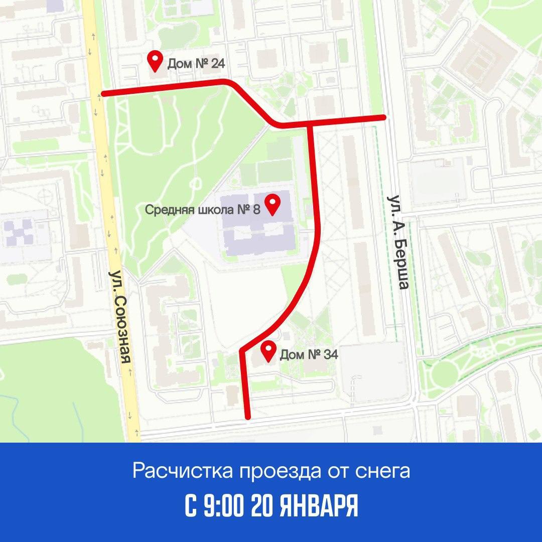 — проезд от ул. Архитектора Берша в сторону ул. Союзной около д. 8 в сторону домов № 24, 26, вдоль школы №8 в сторону домов № 34, 36