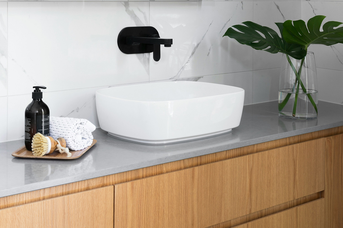 - Столешницы под накладные раковины: их можно адаптировать под любые размеры, а установка сантехники становится проще за счет отсутствия необходимости врезки.