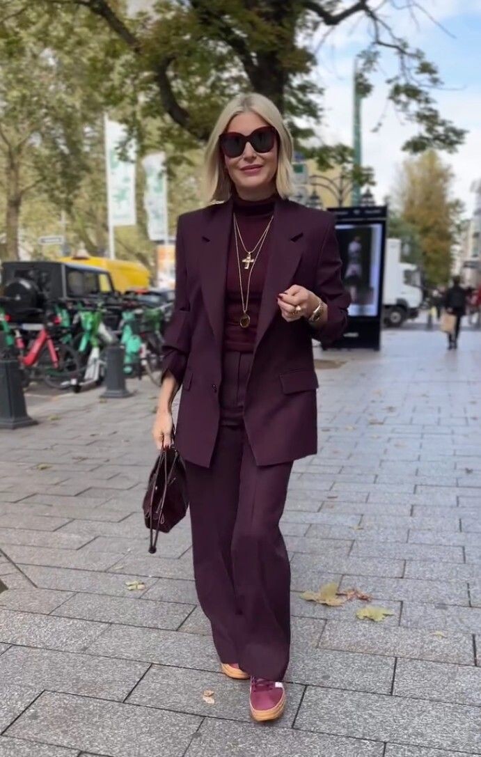 - Бордовый брючный костюм — оптимальный выбор для разнообразных мероприятий. Удлиненный жакет и свободные брюки создадут элегантный силуэт. Водолазка сливового оттенка станет прекрасным дополнением.
