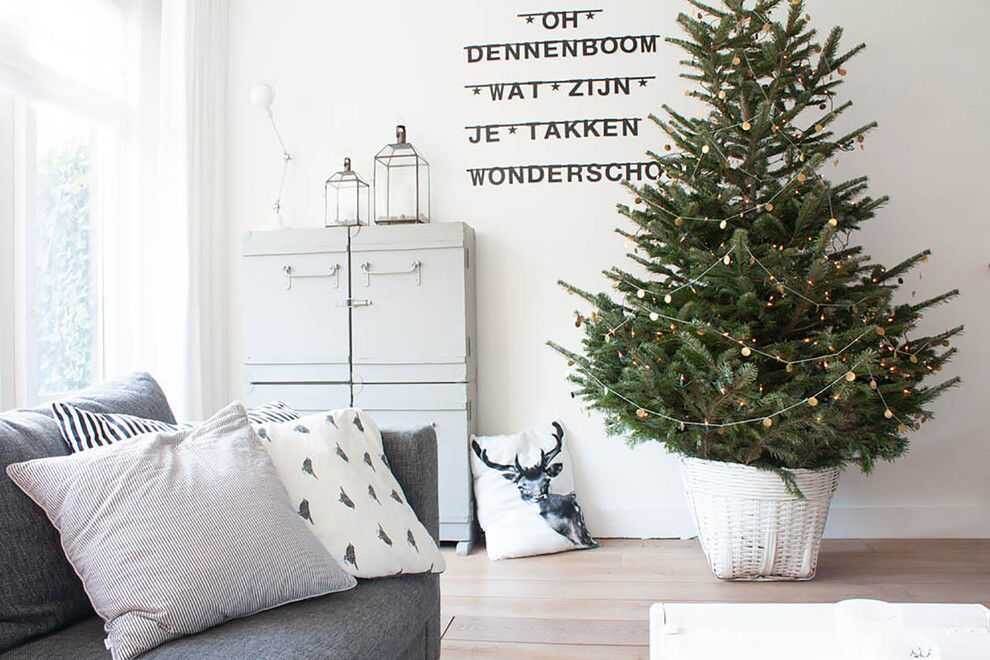 Дальше дому внимание к месту размещения и к воде. Ёлку ставят в ёмкость с водой, если возможно — сразу в отдельное ведро, которое можно украсить так, чтобы не нарушать интерьер. Периодически меняйте воду и контролируйте уровень влаги — чем больше вода, тем дольше дерево живет.