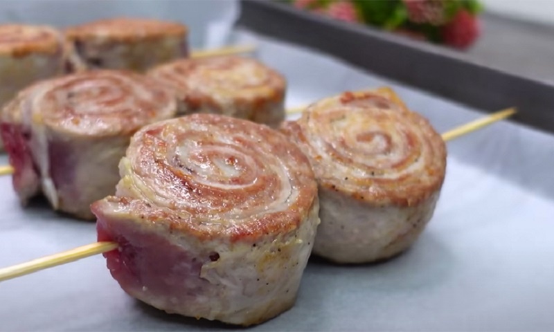 Для рулетов лучше выбирать свиную вырезку или другое нежное филе. Мясо нарезают тонкими полосками, прикрывают плёнкой и слегка отбивают это гарантирует равномерную прожарку и мягкость. На каждый кусок кладут специи (соль, чёрный перец, сушёный чеснок), затем полоску бекона, сворачивают в плотный рулет и нанизывают на шпажку. Перед выпечкой шпажки замачивают в воде, чтобы они не подгорали.