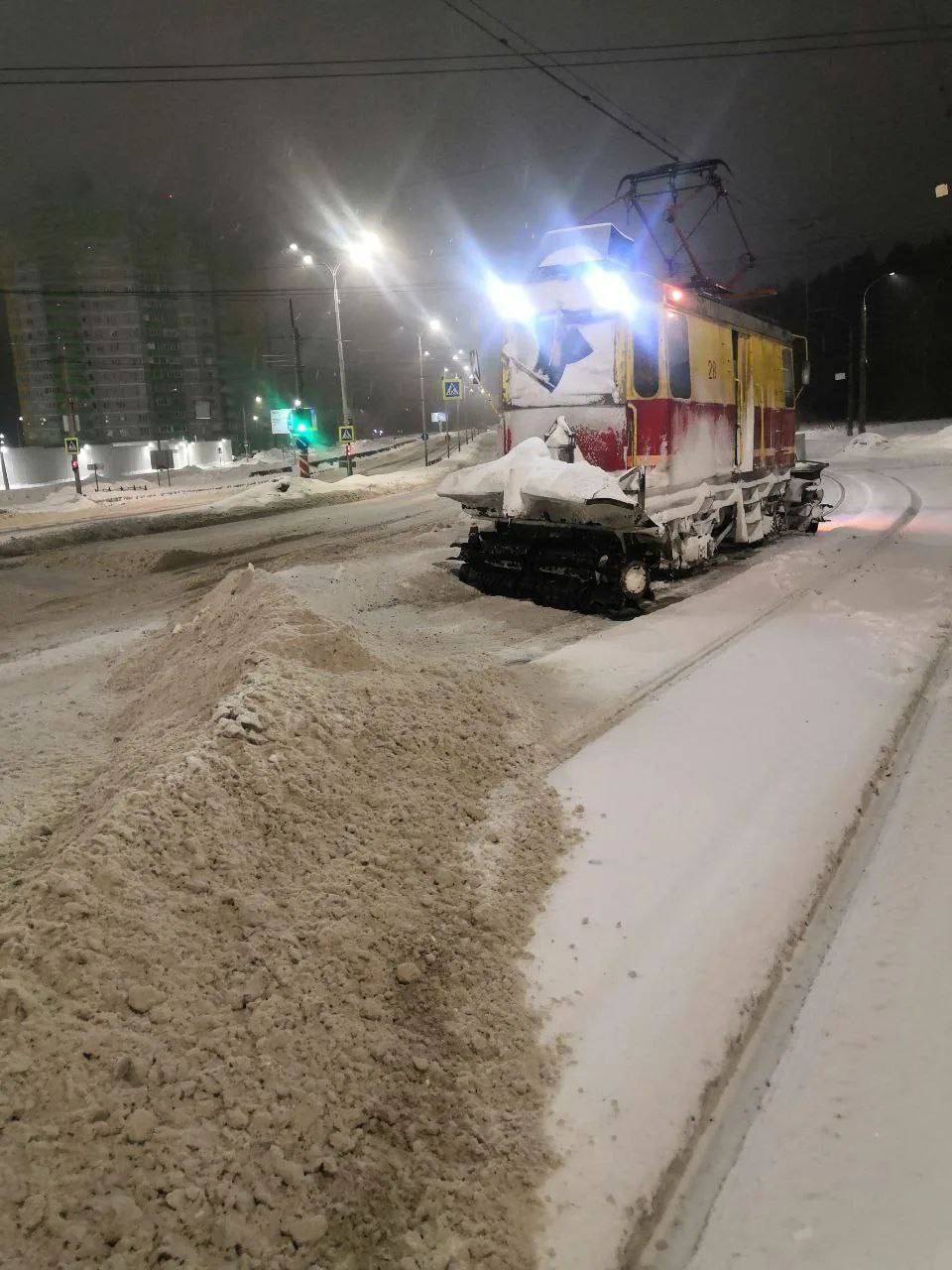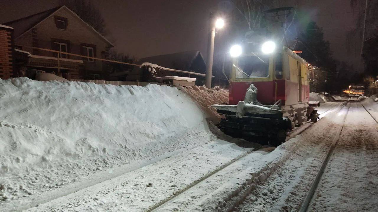 Помимо этого, ежедневно ночью в работу выходят вагоны-снегочисты - специализированная техника для очистки трамвайных путей.