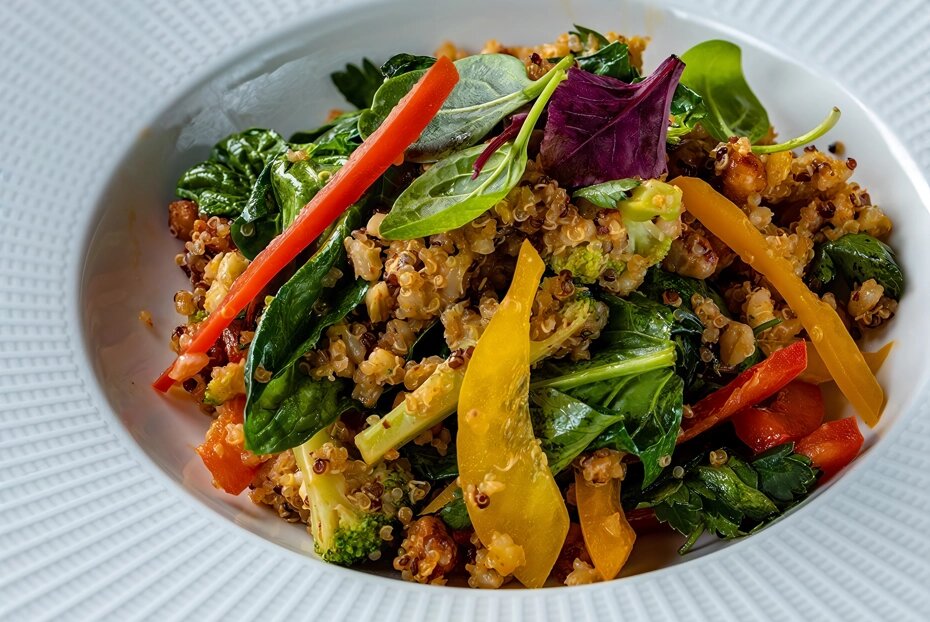 Салат, созданный шеф-поваром Алексеем Павловым из Сочи, стал настоящим открытием на гастрономической карте. Основу этого произведения кулинарного искусства составляют бобовые и злаки, что делает его не только вкусным, но и полезным. Здесь встречаются любимые ингредиенты как профессиональных поваров, так и диетологов: консервированный нут нежно обволакивает вкусовые рецепторы, перловка добавляет характерный ореховый оттенок, а киноа, словно маленькие бусинки, весело хрустит на языке. Все это великолепие убаюкивает насыщенная многослойная заправка с добавлением кокосового молока, соевого соуса и кинзы, приправленная ярким соусом кимчи.