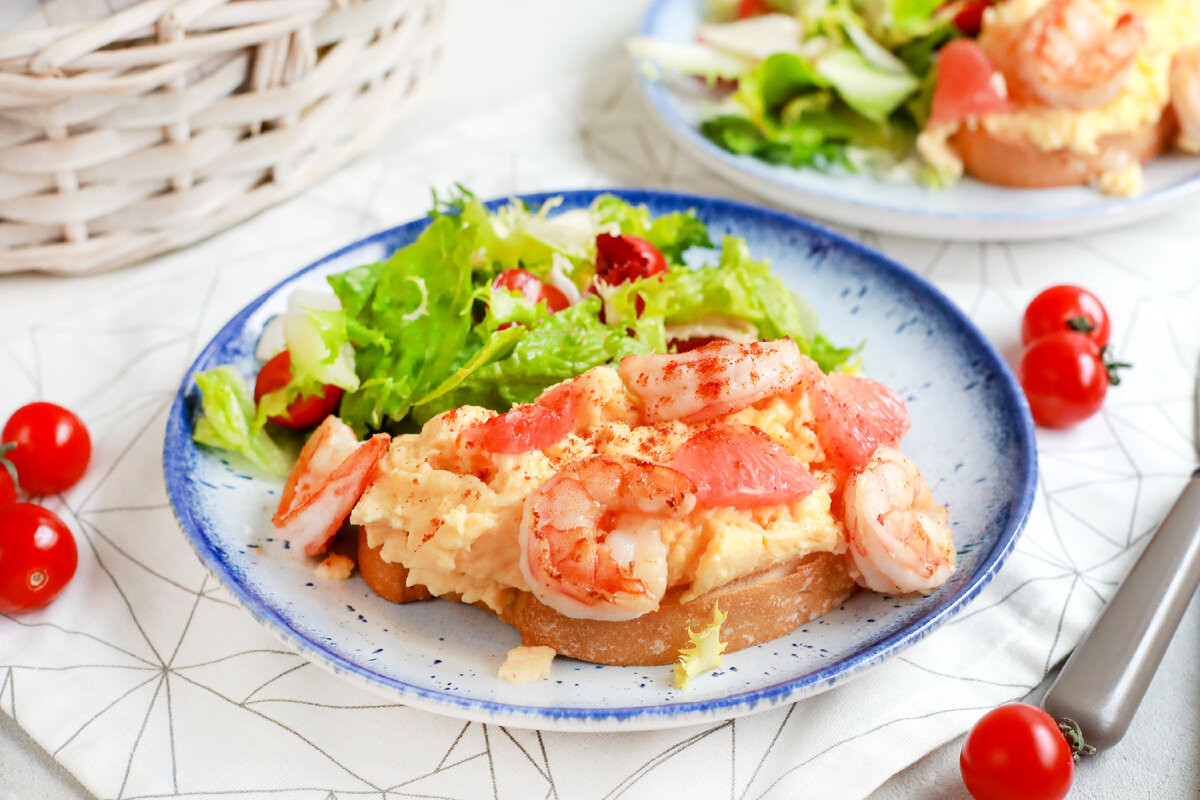 Завтрак — это не просто прием пищи, это начало нового дня и заряд энергии. Попробуйте оригинальный вариант с креветками и грейпфрутом на домашнем хлебе с нежным скрэмблом и свежим салатом. Этот сытный и освежающий завтрак не только поднимет настроение, но и обеспечит необходимыми витаминами и минералами.