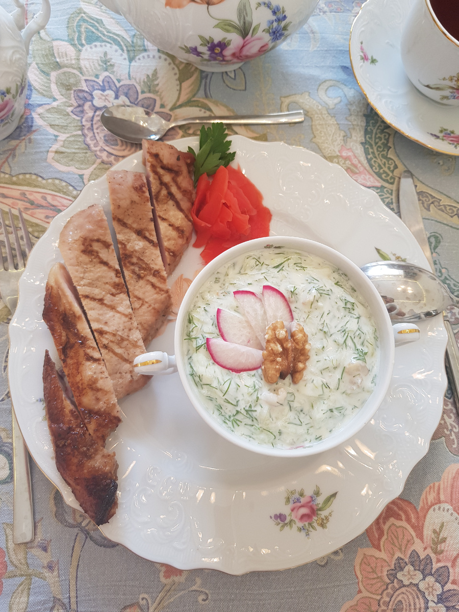 Подавайте таратор в бульоннице. Можно разбавить его водой или айраном для более легкой текстуры, а также украсить редиской и орехами для эстетического удовольствия. Этот легкий салат идеально дополняет ароматную свинину, запечённую на гриле, маринованный имбирь и зелень петрушки, создавая великолепное гастрономическое сочетание.