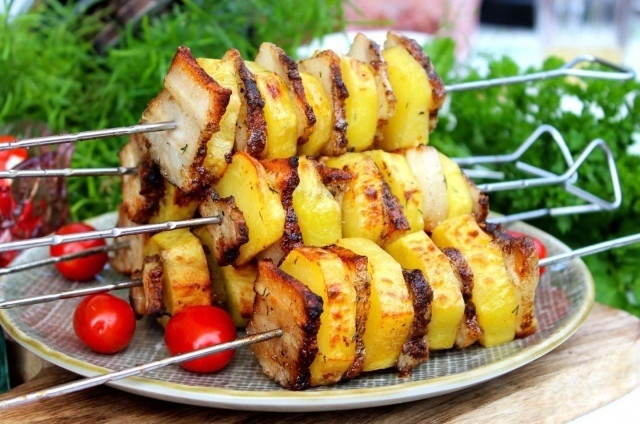 5. Нанижите картошку на шампуры, чередуя с кусочками сала, заверните их в два слоя фольги и разожгите мангал.