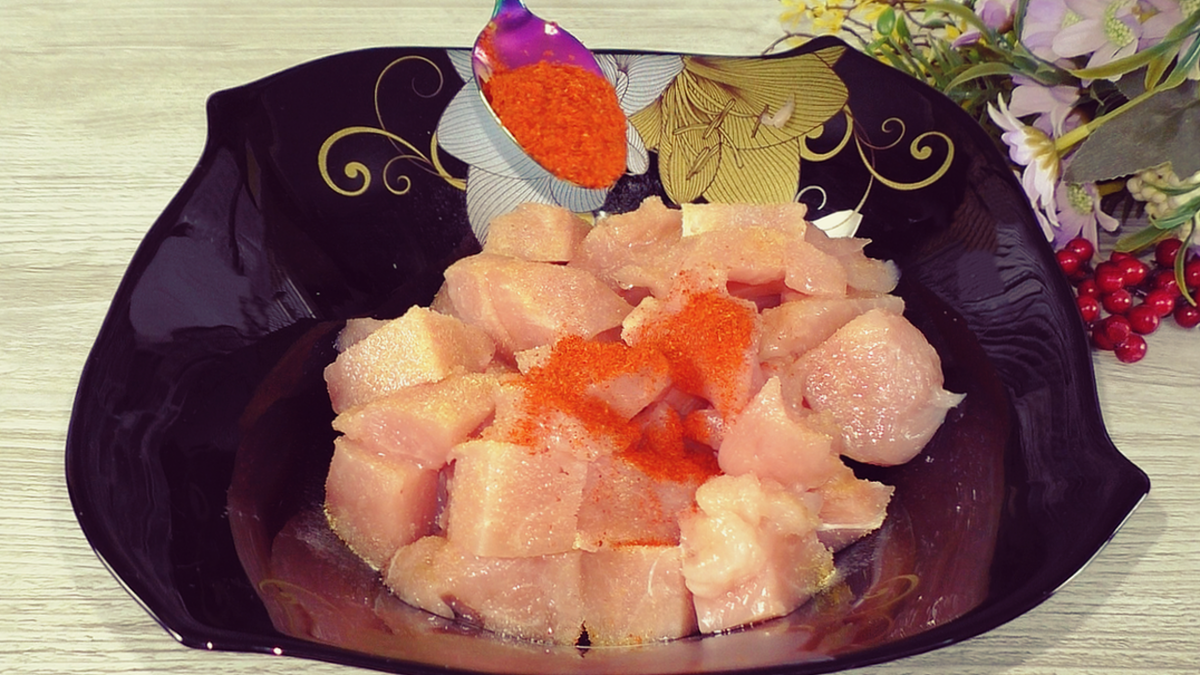 Куриное мясо следует заранее замариновать. Для этого филе необходимо посыпать солью, чесноком, паприкой и добавить растительное масло. Хорошо перемешать и оставить настойку на некоторое время.