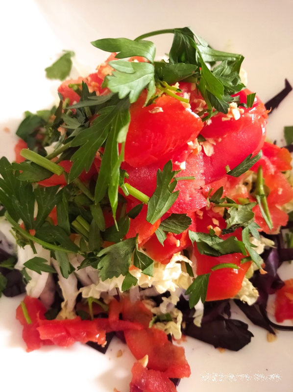 Режим пекинскую капусту, помидор, а грибы нарезаем мелко. Лук следует нарезать на четверть кольца, при необходимости промыть, чтобы убрать горечь, и отжать. Все ингредиенты аккуратно перемешиваем, добавляем масло и специи по вкусу. Получается легкий и полезный салат, который можно дополнительно разнообразить добавлением фасоли, горошка или кукурузы.