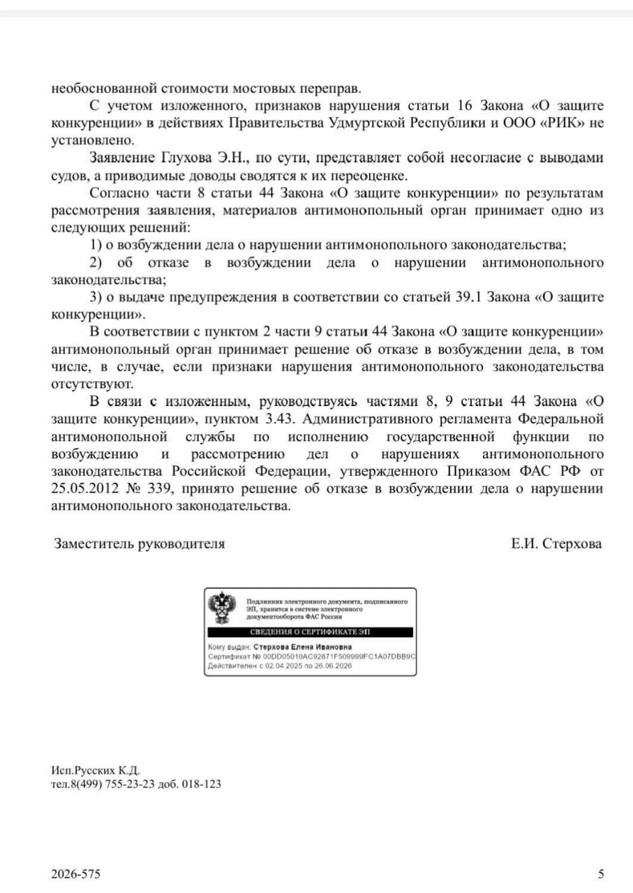 «Признаков нарушения статьи №16 Закона "О защите конкуренции" в действиях правительства республики и ООО „РИК“ не установлено. Заявление представляет собой несогласие с выводами судов. В соответствии с п. 2 ч. 9 ст. 44 Закона „О защите конкуренции“ Антимонопольный орган принимает решение об отказе в возбуждении дела», — говорится в ответе ведомства.
