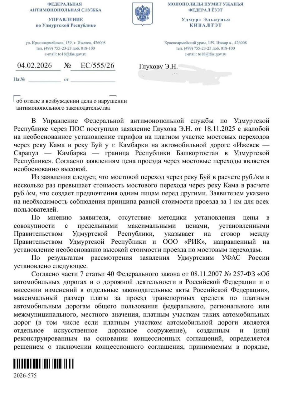 С доводами о необоснованном установлении тарифа на платных мостах в УФАС России по Удмуртии в ноябре прошлого года обратился активист из Камбарки Эдуард Глухов. По его мнению, постановление правительства республики об использовании на платной основе мостовых переходов через реки Каму и Буй не соответствует нормам ФЗ «Об автомобильных дорогах и о дорожной деятельности». Также в своем обращении активист заявлял о возможном сговоре между правительством Удмуртии и концессионером, который привел к установлению необоснованно высоких цен.