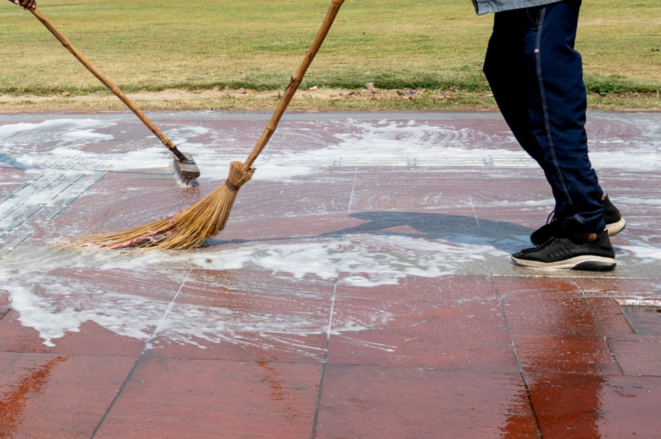 - Смочить тротуарную плитку водой для смягчения загрязнений.
