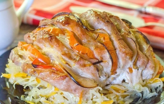 5. На дно формы для запекания выкладываем морковь и капусту, затем сверху размещаем мясо. В прорези мяса помещаем перец, лук и яблоко. Оборачиваем все в рукав, делаем в нем несколько проколов, завязываем концы. Помещаем в разогретую духовку и запекаем в течение 1 часа.