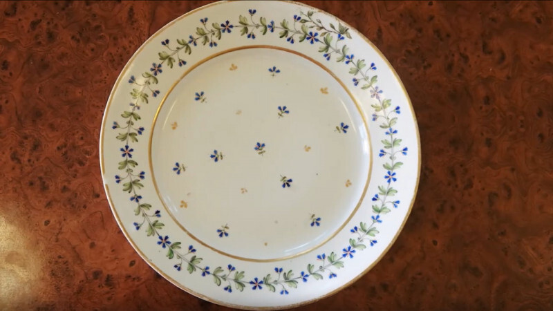 Тарелка, входящая в так называемый «сервис с васильками», выполнена на Императорском фарфоровом заводе в краткий период царствования императора Павла I. Этот сервиз, украшенный любимыми цветами императрицы Марии Федоровны, стал настоящим символом своего времени.