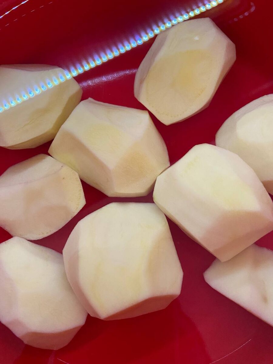 - Очистите картофель и нарежьте его дольками, как для жарки — это придаст аппетитный вид;