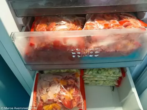 На данный момент в морозильной камере хранятся кабачки, помидоры и сладкий перец. Эти овощи можно смело использовать для пасты. Для начала на сковороде выкладываются замороженные овощи: кабачки, половина пакета помидоров и перцев.