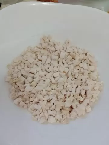 1. Начать стоит с подготовки куриной грудки: отварить ее до готовности и нарезать маленькими кубиками.