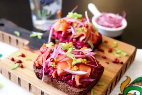 Теперь на очередь нарезка рыбы: подкопченный кижуч следует нарезать тонкими ломтиками. Далее соберите сморреброды: на ржаном хлебе разместите свекольную массу, сверху выложите рыбу, добавьте маринованный лук и зернистую горчицу. Перед подачей украсьте зелёным луком и розовым перцем.